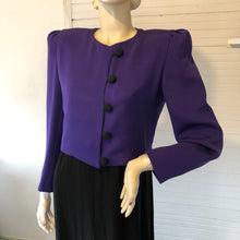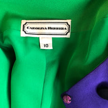 Description: This indubitably once had a matching dress, but I did not find it in the shop where I bought the jacket, try though I did. It’s pretty awesome on its own, though. I’m a longtime fan of Carolina Herrera’s work and this is about as 80s Herrera as it gets: boldly colored silk, epic shoulder pads, cropped length and vivid green contrast lining. Silk-covered buttons are black. There’s a cool ruching detail near the hem in back on the left, too. USA made.
