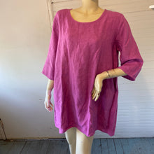 Description: I’m pretty sure this sleek little pullover piece is meant to be a dress, as it’s long enough to function as one even on my extra-tall mannequin, but if you’re also tall you could layer it as a tunic. If you’re not, it’s absolutely a dress. A-line cut, three-quarter sleeves. Nice substantial 100% linen, great hang and drape, nothing skimpy about it. USA made.
