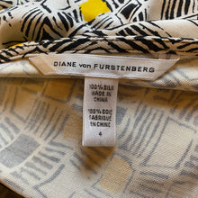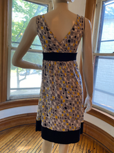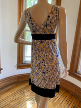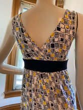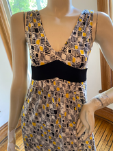 Description: Sleeveless silk dress in black/yellow geometric pattern on ivory with black banding at the waist and hem. Easy pullover styling, V neckline in both front and back.