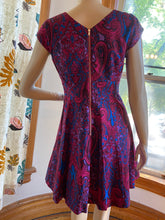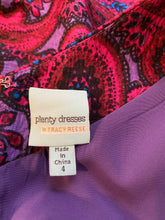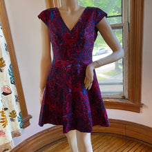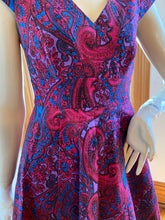 Description: Beautifully vivid pink/purple (with blue accents( paisley print from Plenty (say that one fast if you can) by Tracy Reese, cotton/spandex with polyester/spandex lining. Features include cap sleeves, fitted bodice, full skirt, hip level kangaroo pocket, V neckline in both front and back, and center back zip with hook/eye closure.