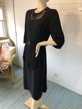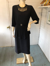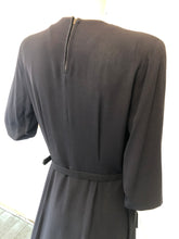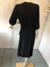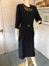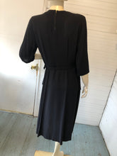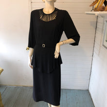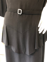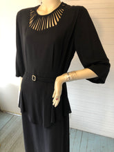 Description: Gorgeous black crepe day dress with cut-out detail at the neckline, peplum at the waist, side and center back metal zippers, and three-quarter sleeves. Hem is ribbon seam bound.