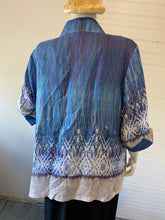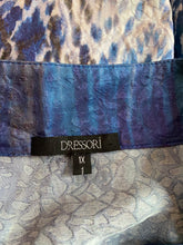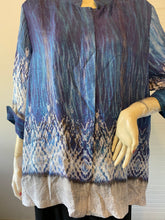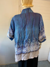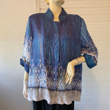 Description: Gorgeous 100% silk top in blue and grey print with hidden button placket (except for topmost button which is visible) and banded collar. Moderate A-line proportions, fabric is lightweight but substantial.