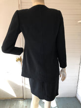 Measurements: Size small based on measurements and the way it fits my mannequin. Jacket measures 15 inches across shoulders from seam to seam; 17 inches across bust from underarm to underarm; 15 inches across at the waist, about 14.5 inches below shoulder; 19 inches across at the hip; 20.5 inches across at the hem; 26 inches long at side of body/26.5 inches long at center back with 22-inch sleeves measured from shoulder seam. Skirt measures 13 inches across at the waist; 17 inches across at waist and at hem; 19 inches long measured at center front.