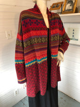 Description: Fantastic long open cardigan in cheery red with "fair isle" multicolor pattern.