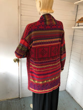 Condition: Very good previously owned condition. I spotted a few minor fuzzies on the sleeves visible at close range, nothing that detracts from the appeal of the sweater. Wool/viscose/nylon/cashmere blend, made in Serbia. Label says "Long cardigan, geometric pattern, cherry."