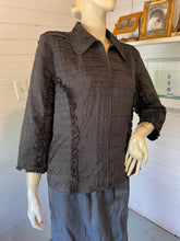 Description: 100% viscose rayon, solid black zip front jacket (or top, I guess, though the zipper makes it seem more like a jacket) is intricately made with piecework and small ruffles.