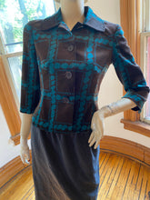 Description: Great little corduroy jacket in teal geometric grid pattern on dark brown background. Fabric is a 60% cotton/38% viscose rayon/2% spandex blend. Single-breasted button front construction, three-quarter sleeves. Fully lined.